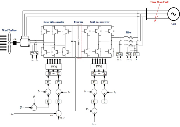 Direct control of the rotor current is used to regulate the output torque. The RSC accomplishes this by supplying the rotor windings with a voltage that matches the desired current. The torque, P controllers on the RSC can be used to regulate the DFIG's output P. The torque, speed, or power is often controlled to their reference value using a PI controller. Regardless of the controller employed, its output is the desired rotor current necessary to provide the desired values. The controller output is the rotor voltage reference and the inner control loop of PI is used to bring the error of rotor current from a reference value. The rotor current can also be utilized to regulate the DFIG's ability to produce Q [43]-[45].