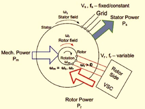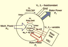 DFIGs have extra capabilities that allow them to function at speeds that are somewhat faster or slower than their inherent synchronous pace. This is advantageous for large DFIGs since wind speed may vary fast. The blades of a WT want to accelerate when hit by a gust, but because synchronous generators are synced to the speed of the power grid, they are unable to do so. The hub, gearbox, and generator all experience significant stresses when the electrical grid pushes back. The mechanism is harmed and worn down as a result. The strains are reduced and the wind gust's energy is transferred to usable electricity if the turbine is permitted to accelerate right away after being impacted by a gust [34]-[36].