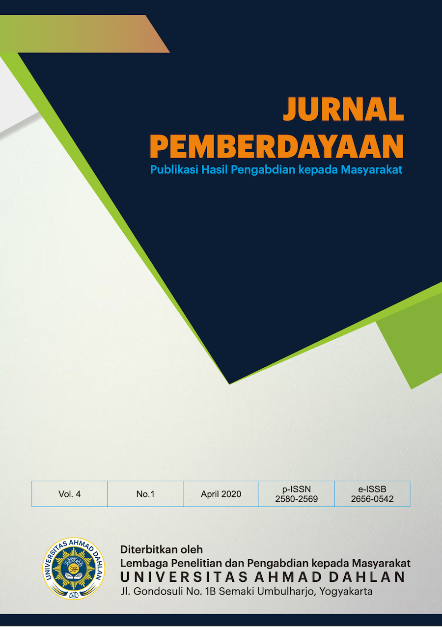 Jurnal Pemberdayaan: Publikasi Hasil Pengabdian Kepada Masyarakat, contains various activities of the teaching staff in UAD in handling and managing the various potentials, obstacles, challenges, and problems that exist in society. Implementation of service activities also involves the participation of the community and partners. Service activities are organized into an activity aimed at improving the welfare of society.
