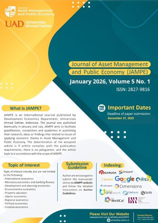Journal of Asset Management and Public Economy, JAMPE, is managed and published by the Department of Development Economics, Faculty of Economics and Business Ahmad Dahlan University. The journal was published biannually in January and July. JAMPE aims to facilitate practitioners, researchers and academics in publishing their research, ideas or findings that related to issues of applying economic theory in Indonesia or other countries in the world. Articles must be scientific, original and unpublished. JAMPE does not publish manuscripts in critical review and book review. Articles published in this journal through the blind review process and reviewed by a minimum of two reviewers. The determination of the accepted article is if the article complies with the publication requirements, there is no plagiarism, and the article topic is in accordance with the scope of JAMPE.