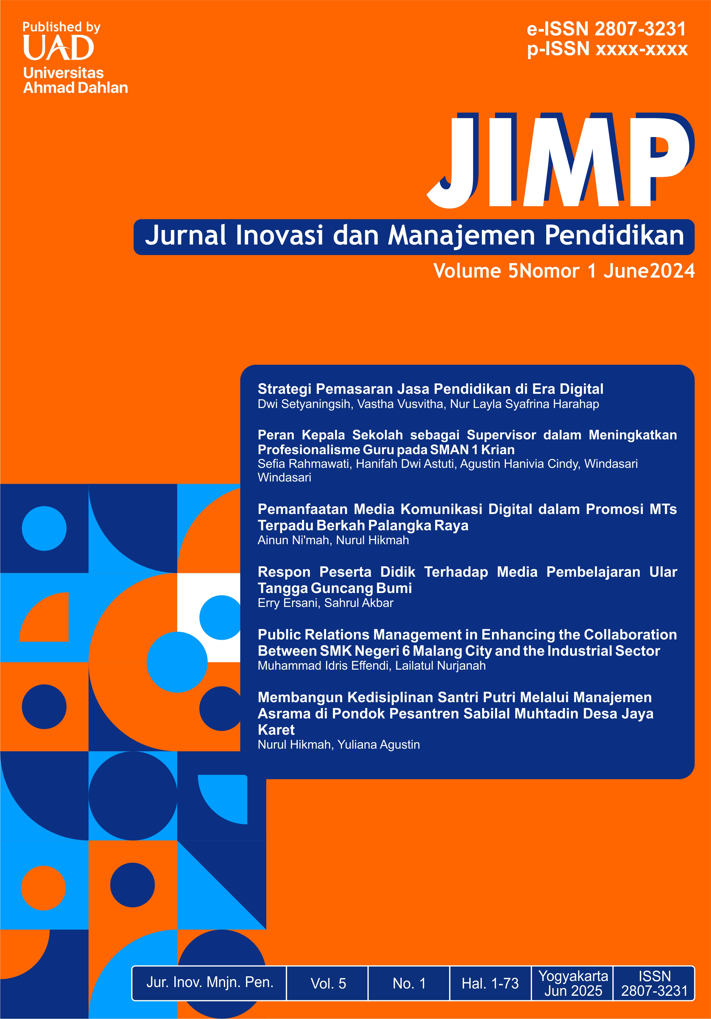 Penelitian ini bertujuan untuk mengeksplorasi dan menganalisis peran kepala sekolah sebagai supervisor dalam meningkatkan profesionalisme guru di SMAN 1 Krian. Melalui pendekatan kualitatif dengan menggunakan wawancara mendalam dan observasi, Hasil penelitian menunjukkan bahwa peran kepala sekolah sebagai supervisor memiliki dampak yang signifikan dalam meningkatkan profesionalisme guru di SMAN 1 Krian. Kepala sekolah, melalui pendekatan supervisi yang terarah, mampu memberikan arahan, bimbingan, dan dukungan kepada guru-guru untuk mengembangkan keterampilan pengajaran mereka. Umpan balik yang konstruktif dari kepala sekolah membantu guru-guru dalam mengidentifikasi kekuatan dan area pengembangan, serta memberikan dorongan untuk terus meningkatkan kualitas pengajaran mereka. Selain itu, kepala sekolah yang efektif sebagai supervisor juga mampu menciptakan lingkungan kerja yang kolaboratif dan memotivasi guru-guru untuk terus belajar dan mengembangkan keterampilan mereka. Hal ini membantu menciptakan budaya sekolah yang progresif dan inovatif, di mana guru-guru merasa didorong untuk terus meningkatkan kualitas pengajaran mereka demi kebaikan siswa.