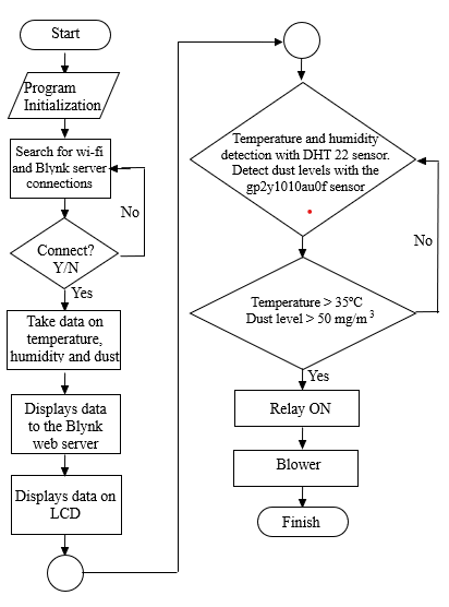 The flowchart is used to simplify the research process which can be seen in Figure 3. The program begins with initializing the program first, then the ESP 8266 microcontroller will connect the Arduino UNO microcontroller to the Blynk server on the smartphone with wi-fi, if wi-fi is connected then the Arduino UNO will take temperature data, and humidity from the DHT22 sensor and dust levels from the GP2Y1010AU0F sensor, from the data will be displayed to the Blynk server which is used as a monitoring system via a smartphone, the results of sensor readings and blower conditions can also be displayed on the 16×2 LCD screen.