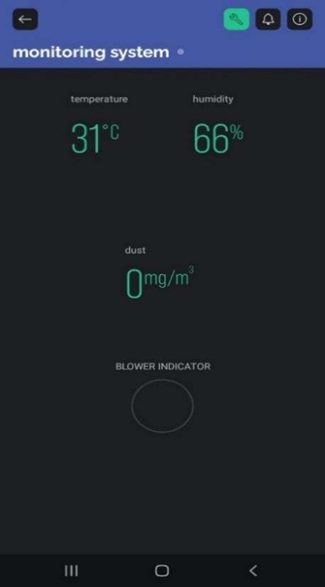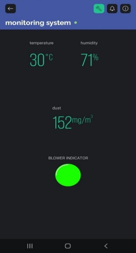 In this research, the Blynk application is used as an interface, with the Blynk application the user can monitor the system work process easily. Before starting the application, the user must activate wifi so that the Arduino UNO microcontroller and ESP 8266 can be connected. Blynk can be used after the microcontroller and Blynk have been connected via wifi [20]. This system works automatically and has been programmed on the Arduino UNO microcontroller so that users only need to monitor temperature, humidity, dust levels, and blower conditions through the display screen on the user's Android. On the Blynk display, the blower indicator will be green if the blower is in Figure 5.