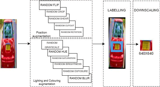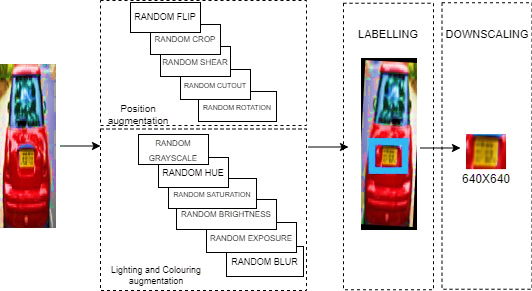 Figure 3(a) shows that preprocessing consists of downscaling, labeling, and augmentations which was used to assure its suitability for training machine learning models. Augmentations add to the dataset, improving model generalization and robustness by introducing variability which is shown in Figure 3(b). These two approaches are implemented in eleven augmentation techniques. Labeling is an important asset in interpreting vehicle plates. Then, The training images are downsized to 640x640 pixels for standardized input size after labeling, allowing for consistent feature learning. The sample of labeling and downscaling is shown in Figure 3(c).
