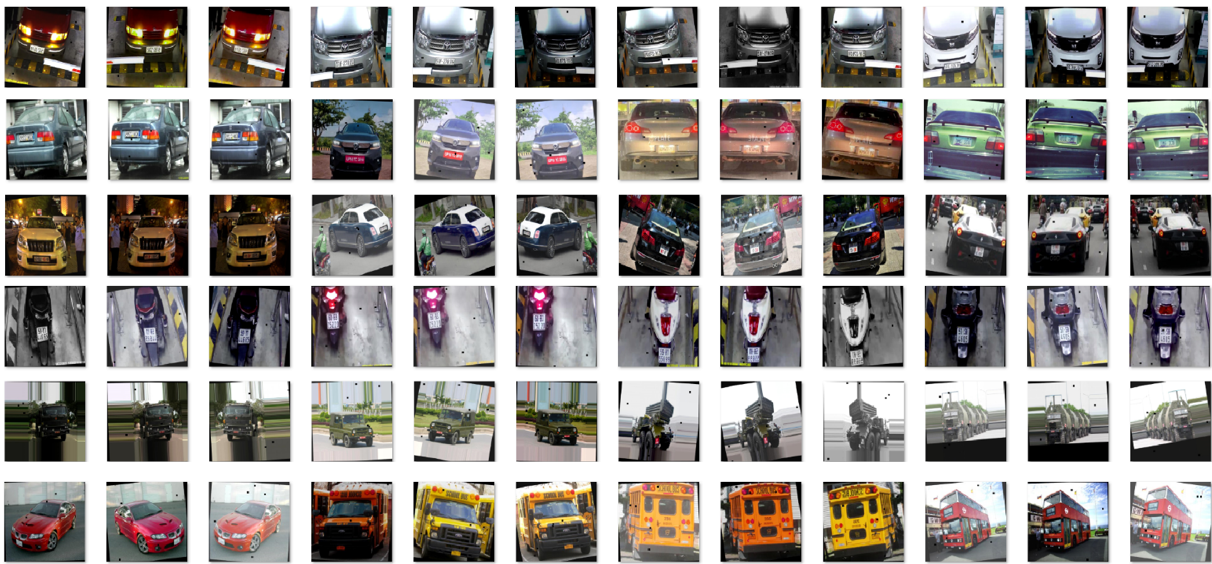 The eleven augmentation techniques are applied simultaneously with random techniques. Five techniques that constitute positional augmentation consist of Flip, Crop, Rotate, Shift, and Crop. Flip is used to augment with mirroring techniques. There are two possible values to be set, namely no flip and horizontal flip. The horizontal flip reflects the recorded vehicle in a different direction. The second augmentation technique is crop which is applied randomly with a choice of no crop or 15% crop. The third technique is random rotation which is used to achieve orientation variations. Horizontal and vertical shear is the fourth technique used to achieve perspective distortion. Five rectangular cutout regions were applied to simulate occlusions or noise.