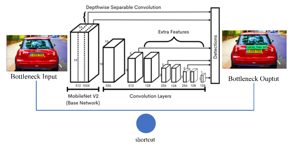 Based on Figure 4, MobileNetV2 does depthwise and pointwise convolution. Moreover, MobileNetV2 introduces two new features, consist of: linear bottleneck and shortcut connections. Depthwise convolution uses a single convolutional filter for each input channel, whereas pointwise convolution creates a linear combination of the depthwise convolution outputs. The bottleneck part contains inputs and outputs from the model, whilst the inner layer or layers encapsulate the model's capacity to convert information from lower level concepts (pixels) to higher level descriptors (picture categories). Tensorflow combines MobileNetV2's with the SSD framework to enable real-time detection. The procedure begins with the model processing the full image, extracting information at various scales. SSD MobileNetV2 then localizes and classifies items, including license plates, while anticipating bounding boxes and class labels. Post-processing techniques refine predictions by deleting duplicates and false positives. The final result includes accurate bounding boxes around recognized items, as well as their labels and confidence scores. This streamlined approach offers rapid and dependable license plate detection in a variety of applications.