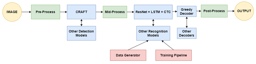 The incorporation of EasyOCR into the ANPR architecture to enable accurate text recognition on vehicle license plates. EasyOCR is an open-source Python program that provides an intuitive interface for Optical Character Recognition (OCR) activities. Its simplicity and efficiency make it an excellent addition to our ANPR system, allowing for seamless text extraction from license plate photos. In this study, license plate identification is achieved by combining TensorFlow using SSD MobileNetV2, and EasyOCR as the text recognition library. Figure 8 depicts the process of text recognition using the EasyOCR library. The first step of EASY OCR is feature extraction. The input data must be converted using VGG and Resnet to create a set of features. Resnet is a type of convolutional neural network (CNN) that uses skip connections or shortcuts to go around some layers, whereas Visual Geometry Group (VGG) has a homogeneous architecture consisting of very small (3x3) convolution filters. Then Sequence Labeling is carried out after feature extraction using a Long Short-Term Memory (LSTM) network. LSTMs are superior to traditional RNNs because have a unique design that helps avoid the vanishing gradient problem. Decodering is the last step which employed the Connectionist Temporal Classification (CTC). CTC adds a blank label to the list of current labels in order to produce a prediction with varying length. Because it computes loss by adding up all possible alignments of the input to the target sequences, it is then ideal for OCR decoding applications. The output result is shown in Figure 9.