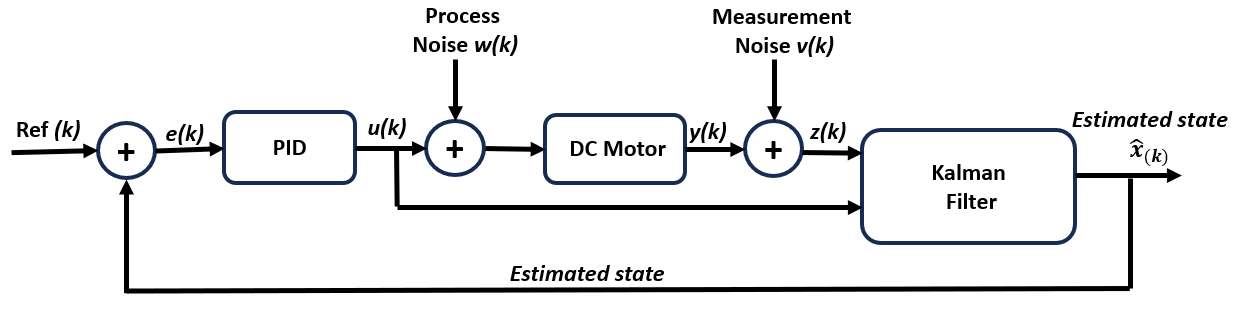 The proposed control system design is shown in Figure 3. Angular velocity of DC motor is assumed to have a measurement noise with a covariance of R and a process constant error