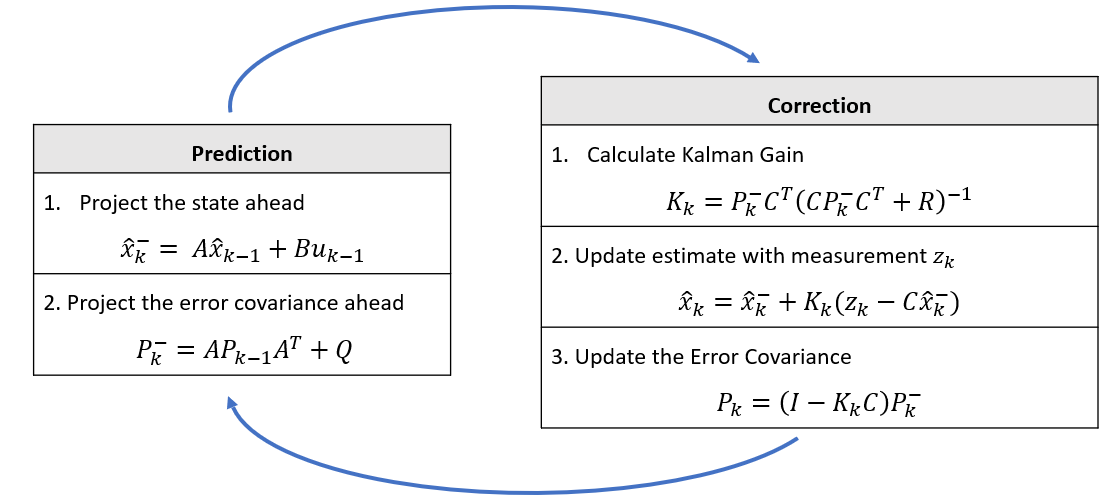 The Kalman filter consists of two main step: prediction and process. The algorithm and equations on each step can be seen in Figure 2. [16] provides details of the equations used. The Kalman filter uses these equations iteratively, making predictions of the system’s state and then updating these predictions with new measurements. It provides a statistically optimal estimate of the state by taking into account both the system dynamics and the measurement noise. The filter adapts to changes in the system over time and provides a way to improve state estimates in noisy environments.