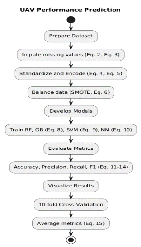 This study employs a rigorous methodology to predict UAV performance using advanced machine learning techniques. The methodology consists of five key stages: dataset preparation, data preprocessing, model development, evaluation metrics, and experimental design. As presented in the Figure 1, each stage is described comprehensively to ensure clarity and reproducibility.