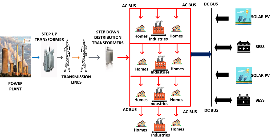 The optimization technique presented in this study was first validated on an IEEE 33-bus radial feeder, thereafter, it was also tested using a Nigerian 11kV feeder as a case study. Figure 1 shows the concept of the proposed work, which depicts how power is transferred from the generation plants down to the customers while the RES is integrated at the distribution end. The maximum load recorded on the Nigerian 11kV feeder is 3.43MW and 2.76MVAr, and this feeder covers a relatively large geographical area. So many commercial activities that involve industrial loads and also residential facilities connected to the feeder have caused it to experience real power losses, incessant outages, and voltage deviation, which makes it important for it to be investigated and a solution provided. The integration of SPVG and BESS into the distribution network was strategically chosen due to their complementary roles in enhancing grid stability and reliability. SPVG alone is inherently intermittent, as its output fluctuates with changes in sunlight intensity due to weather conditions and time of day [14]. To address this limitation, the BESS plays a critical role as a power reserve. Charging and discharging the BESS during off-peak periods and peak periods respectively, can reduce the peak demand on the power grid [15]. It smartly compensates for the variability and unpredictability of SPVG output, ensuring a steady power supply.