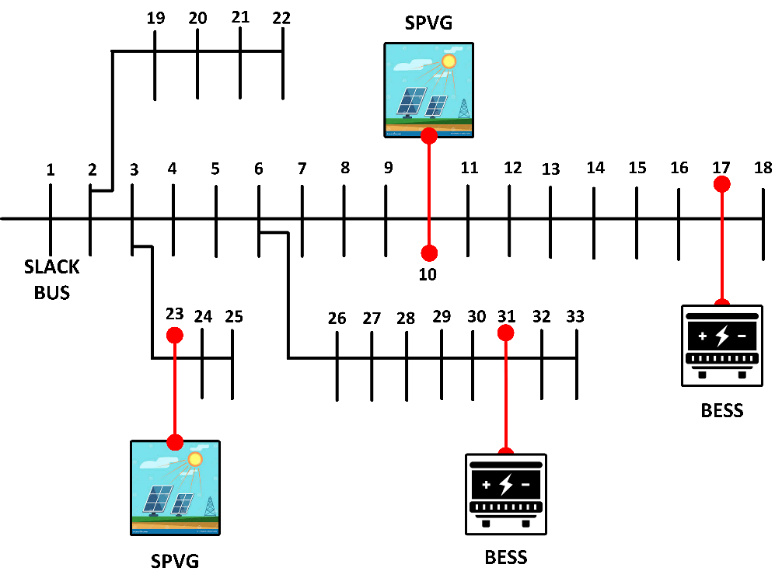 Technological advancement and advanced industrialization have significantly created a huge electricity demand worldwide. Unfortunately, conventional energy sources are insufficient to cater for the increased demand because they are not environmentally or economically supportive [1]. Integrating renewable energy sources (RES) into distribution networks has gained significant traction across numerous countries as a strategy to reduce reliance on fossil energy, which significantly contributes to reducing greenhouse gas emissions. Given its crucial role in mitigating climate change, RES is often highlighted among the top global advancements to combat the adverse effects of rising temperatures [2]. Unlike conventional energy sources, it does not emit greenhouse gases such as carbon dioxide, which drive global warming. Recent projections indicate that by 2050, RES will account for approximately 85% of global electricity generation, with only 15% derived from non-renewable sources [3]. Examples of RES include solar photovoltaic generation (SPVG), battery energy storage systems (BESS), wind turbines (WT), and various natural sources that have been used as a substitute to provide electricity generation for the last decade or more. Also, reducing the abundance of fossil fuels and global warming has forced utilities to rely more on RES. SPVG has proven to be a reliable RES, and it has been successfully incorporated into various radial distribution networks (RDN) primarily because of its pristine energy source, cheaper operating cost, and availability [4].