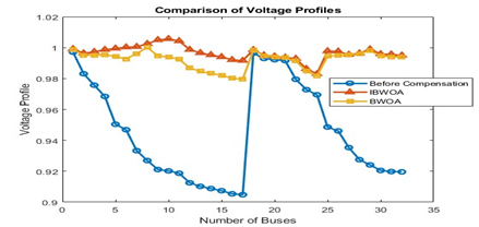 Figure 6. IEEE 33-bus Distribution system voltage profile for BWOA and IBWOA