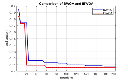 Figure 8. Convergence characteristics of BWOA and IBWOA