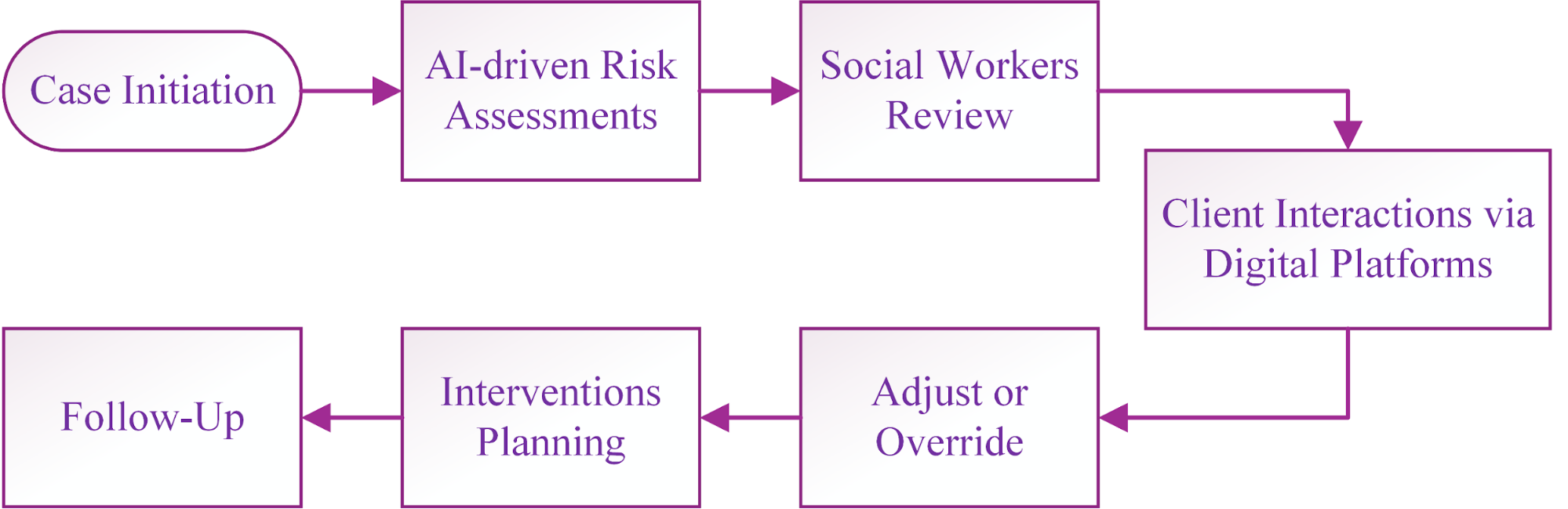 The system flow diagram (Figure 1) visually represents the iterative and dynamic nature of AI-mediated social work practice, emphasizing human oversight and judgment throughout the process. It begins with case initiation, where social workers collect initial client information and concerns. AI-driven assessments and preliminary analyses subsequently inform practitioners about potential client needs and intervention priorities. Critically, this automated analysis is reviewed by social workers through direct, empathy-driven interactions with clients via digital platforms. Practitioners retain ultimate decision-making authority, actively adjusting or overriding AI recommendations as necessary. Finally, the process involves planning and executing tailored interventions, followed by continuous follow-up and reassessment activities. This iterative depiction accurately captures the complexities and nuances inherent in real-world social work decision-making processes, highlighting the indispensable role of human relational competencies alongside technological tools.