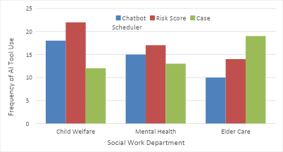 Figure 2 illustrates the frequency of AI tool usage across three social work departments: Child Welfare, Mental Health, and Elder Care. In Child Welfare, the AI-driven Risk Score tool was most frequently employed (n = 22), reflecting a greater reliance on predictive analytics to rapidly assess risks and prioritize interventions. Mental Health practitioners frequently utilized Chatbots (n = 18), supporting ongoing client interaction and immediate engagement. In Elder Care, Case Schedulers were the most frequently adopted tool (n = 20), emphasizing the need for organized, automated management of routine tasks and appointment scheduling. These departmental differences underline distinct practical priorities and demonstrate the varied perceptions and reliance on AI tools across social work practice domains.