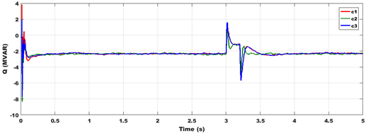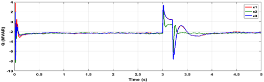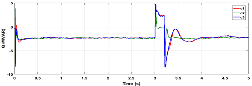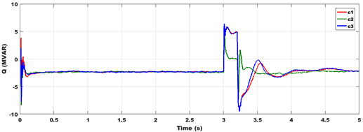 The suggested method is tested with a fault period of 200 ms under a 70% VD as depicted in Figure 7. In part (a), P falls at fault, whereas parts (b), (c), and (d) show a rise in Q,