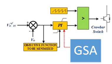 The idea presented in this paper concerns the DCLV control of a DFIG, where power converters are costly. It was focused on crowbar control which permits to mitigation of overvoltage at the DCL which could be produced under faults. As given in the introduction section, the structure of the proposed strategy allows us to overcome the weak points of recent methods described previously. This is for the reason that it ensures robustness under the presence of faults as demonstrated through the obtained outcomes. The GSA proves its role in helping the crowbar to operate efficiently. The developed method is based on simple formulas and it was insensitive to sensors’ noises and offsets. Utilizing optimization based on the GSA, the PI controller for a DFIG was optimized. It was discovered that the controller parameters produced using GSA have smaller overshoot, settling time, and rising time. In addition to improving system responses, the GSA-based controller significantly supports the wind system to achieve FRTC.