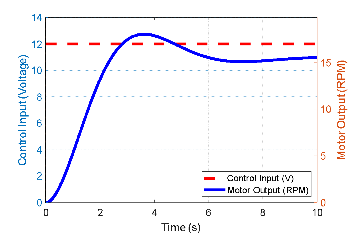 Fig. 6 illustrates the simulated step response of the LX44WG-12-15-527D DC motor under a constant 12V input. The solid blue line represents the motor's output speed in RPM, while the red dashed line indicates the control voltage. Prior to stabilizing at the objective of 15 RPM, the motor exhibits a peak overshoot of around 18 RPM, representing a 20% deviation. This behavior illustrates an underdamped second-order system, marked by a swift rise time, moderate overshoot, and acceptable settling characteristics.