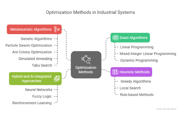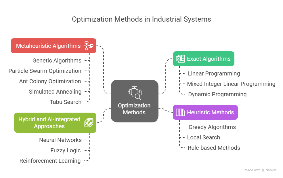 Optimization problems encountered in industrial systems vary widely in structure, scale, and complexity. Accordingly, a diverse array of solution techniques has been developed and applied to address these challenges [18][19]. Based on a comprehensive review of the literature, optimization methods can be broadly classified into four major categories (refer to Figure 1): exact algorithms, heuristic methods, metaheuristic algorithms, and hybrid or AI-integrated approaches [19]. Each class in this figure offers unique strengths and is suited to different problem contexts, reflecting the trade-offs between accuracy, computational efficiency, and scalability.