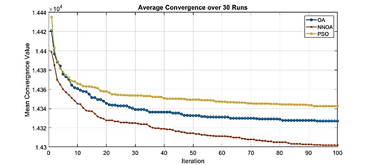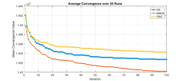 Figure 11. Average Convergence Performance of OA, NNOA, and PSO Algorithms over 30 Independent Runs