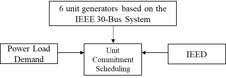 A proficient generrating unit scheduling system is essential to optimize power generation and adequately satisfy load demand. A proficient scheduling strategy utilizing artificial intelligence programming methods is implemented for various producing units. Figure 1 illustrates an optimal scheduling system for six generating units utilize a standard IEEE 30-Bus System dataset [44]. The system has power load demand constraints and an objective function in the form of an IEEE function, which results in generator scheduling optimization and optimal power distribution.