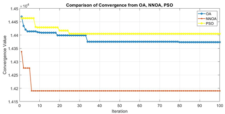 Figure 8. Comparison of OA, NNOA, and PSO convergence plot in 100 iterations