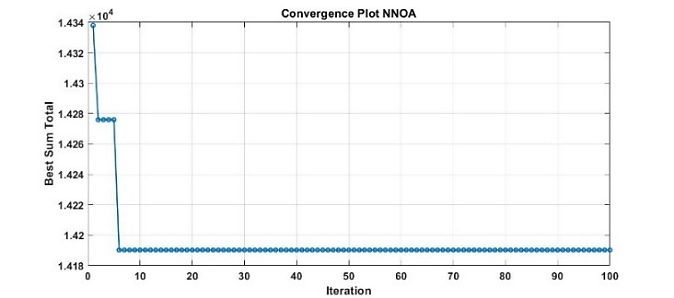 However, a drawback of the NNOA is its total computation time of 0.32819 seconds, which is longer than the PSO's time of 0.18602 seconds. This difference occurs because NNOA has a larger computational load than the PSO algorithm. This is especially apparent when comparing the rapidity of PSO, frequently ascribed to its gradient-like updates, with the more profound metaheuristic investigation of NNOA. The relatively straightforward updating rules of PSO provide expedited computation per iteration, resulting in reduced total execution time. Nonetheless, this enhanced solution quality entails specific performance compromises, especially regarding computational speed and solution consistency, which are typical in metaheuristic optimization.