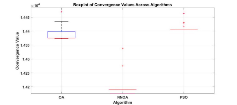 Although NNOA shows superiority in solution quality, there is an observation regarding standard deviation, which is an indicator of performance consistency. Compared to OA (17.7560) and PSO (16.1986), NNOA has the highest standard deviation of 22.2062. In general, a lower standard deviation may indicate that the results obtained are more consistent across executions [55]. In this case, the larger variance in NNOA may indicate that PSO and OA show more consistent performance from one execution to the next. The higher variability in NNOA can be attributed to the more aggressive exploration phase. The velocity update model, which is inspired by the Doppler effect and integrates a non-linear exponential function, could potentially be one of the factors contributing to the more dynamic character of the exploration.