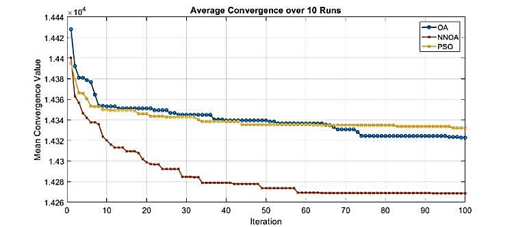 Figure 10. Average Convergence Performance of OA, NNOA, and PSO Algorithms over 10 Independent Runs