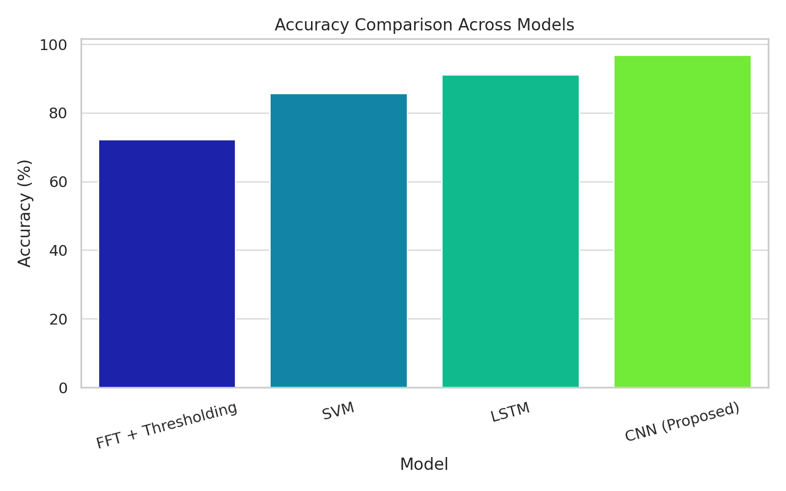 Figure 1. Classification Accuracy of FFT, SVM, LSTM, and Proposed CNN