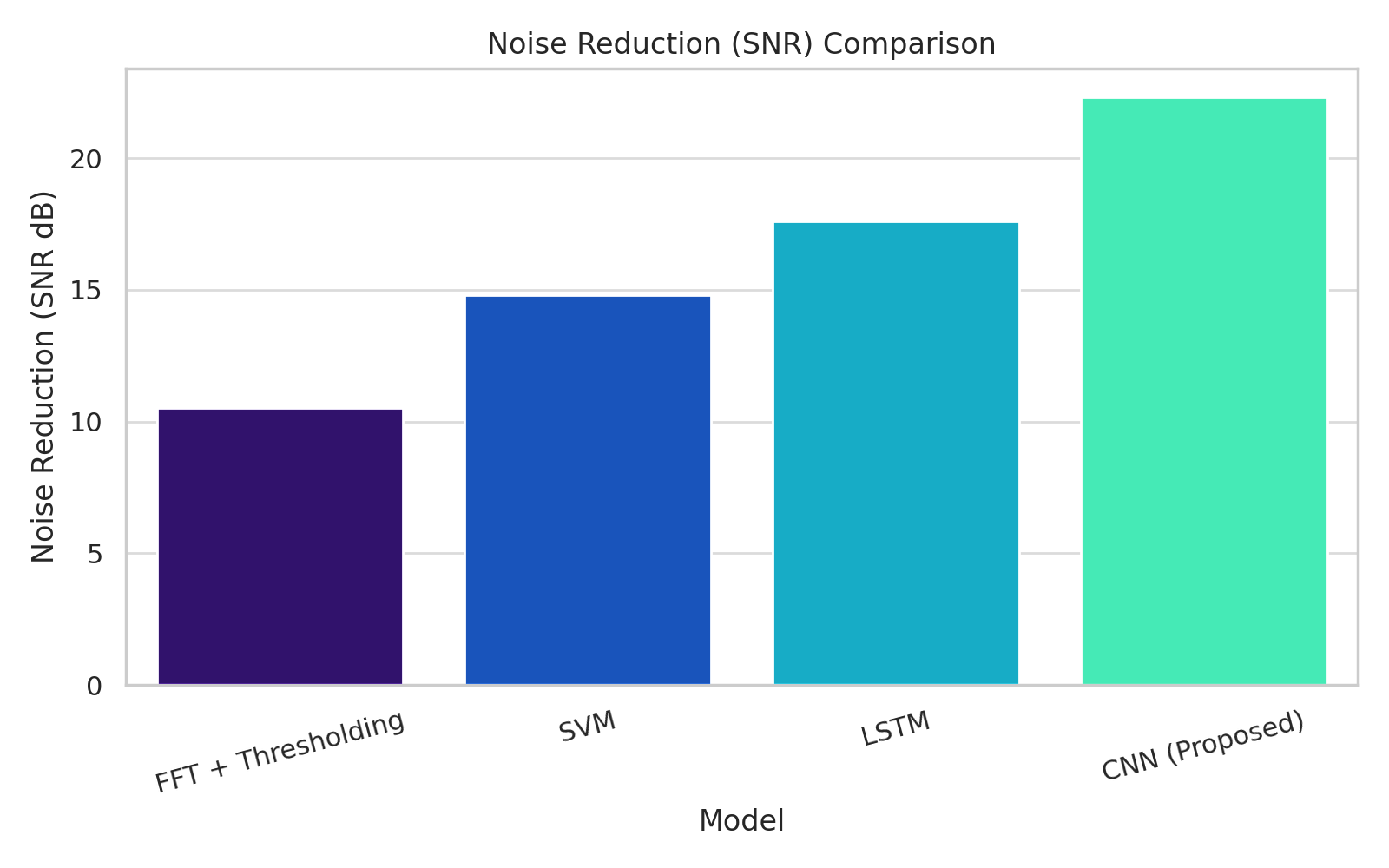 Figure 2 show the bar chart illustrates the noise reduction capabilities of each model, measured in SNR dB. The Y-axis represents Noise Reduction (SNR dB), and the X-axis shows the models. The CNN (Proposed) bar is notably the tallest that indicating its best performance in noise reduction. The figure clearly shows the CNN (Proposed) achieving an average SNR improvement of 22.3 dB. It is a substantial improvement compared to LSTM's 17.6 dB, SVM's 14.8 dB, and FFT + Thresholding's 10.5 dB. The visual difference in bar heights emphasizes that the CNN denoising capability is approximately 26.7% higher than LSTM and more than double that of FFT-based approaches. This strong performance in mitigating noise confirms the CNN's robustness in harsh communication environments, where signals are often corrupted by various noise sources.