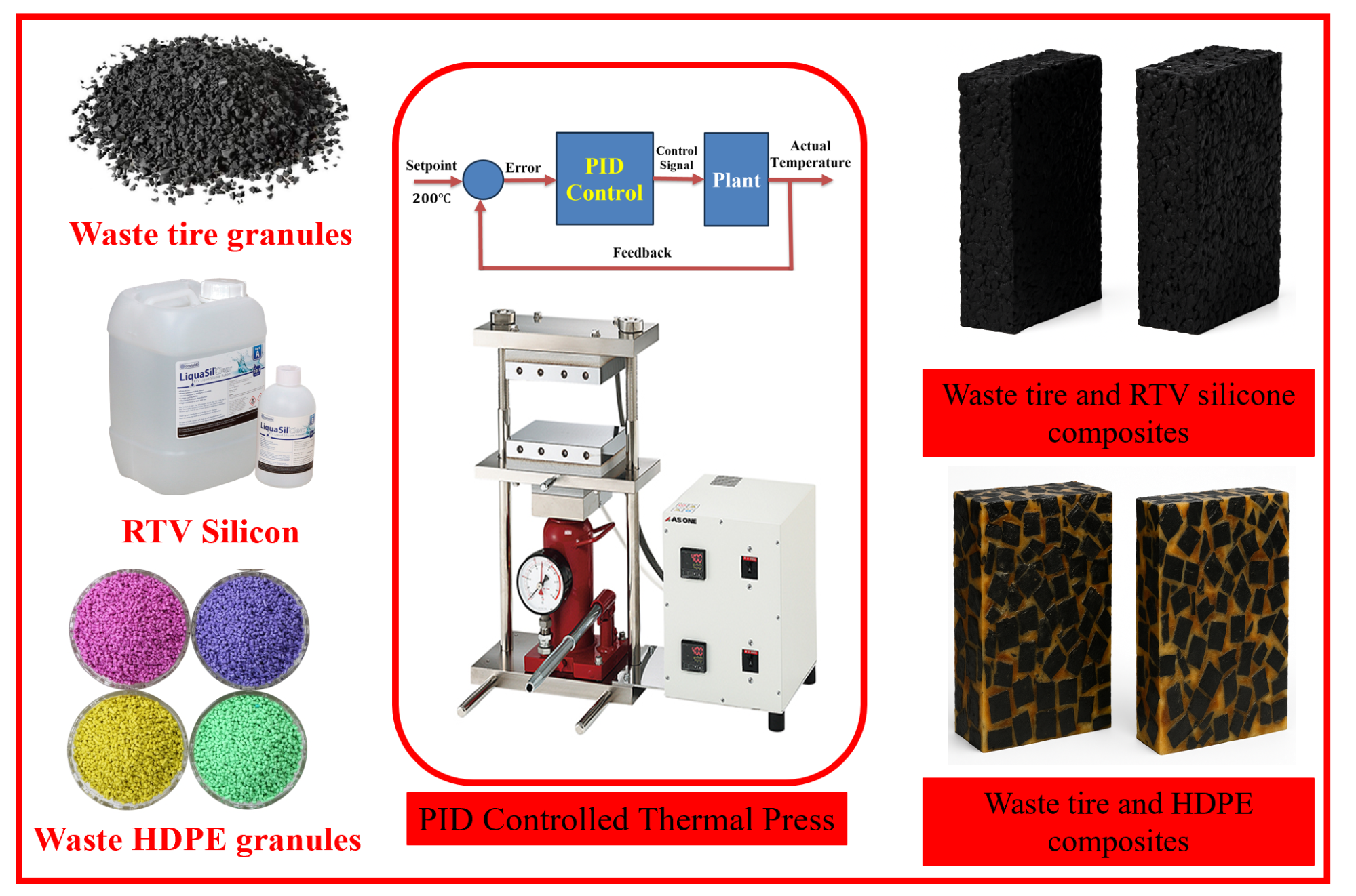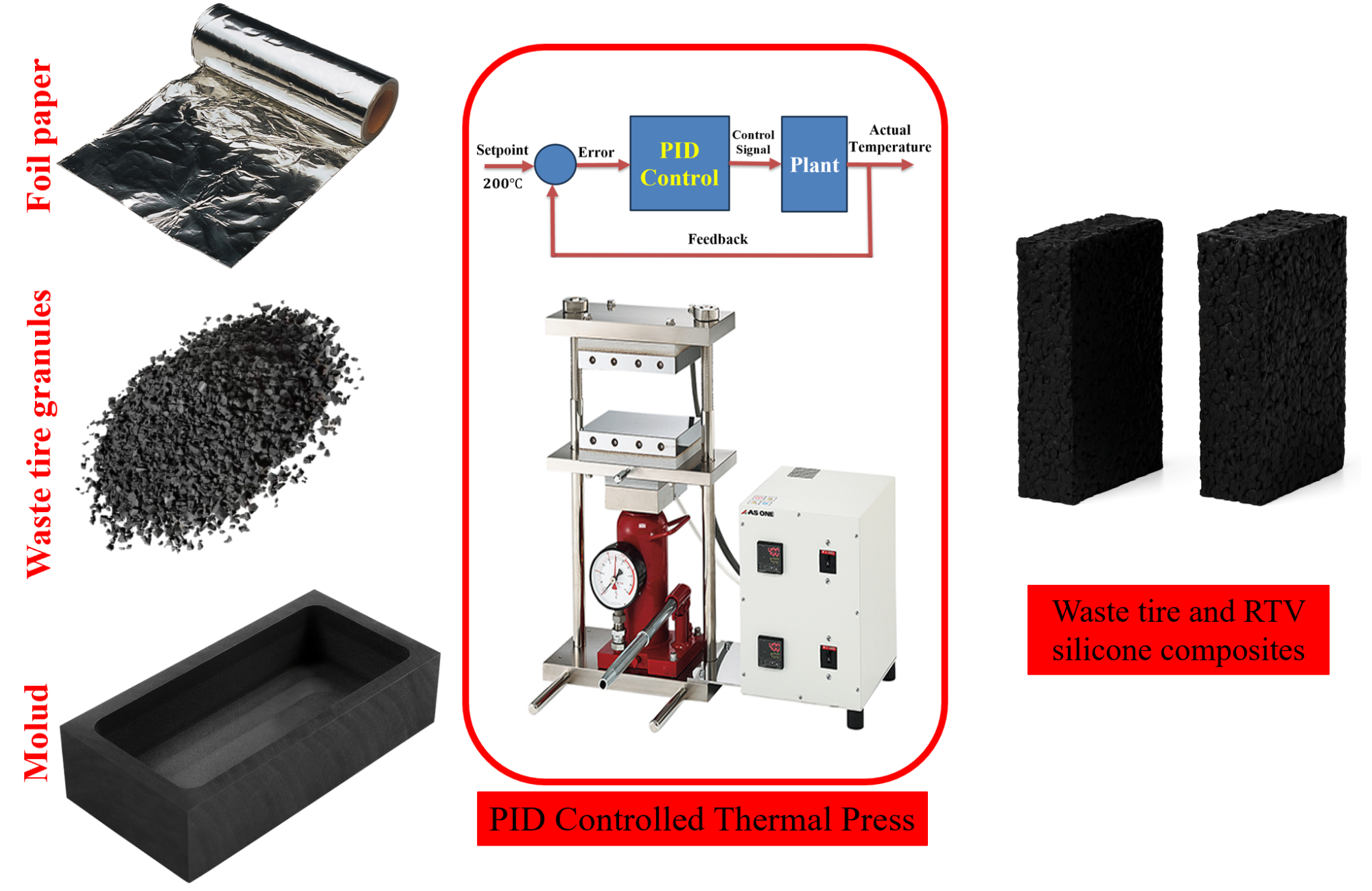 This section consists of three subsections. The first subsection presents the press machine, which is used for the manufacturing of composite materials. Additionally, there was a brief discussion about the PID temperature control that the press machine is equipped with. The second subsection shows the preparation of the waste tire and RTV silicone composites. The third subsection shows the preparation of waste tires and HDPE composites.