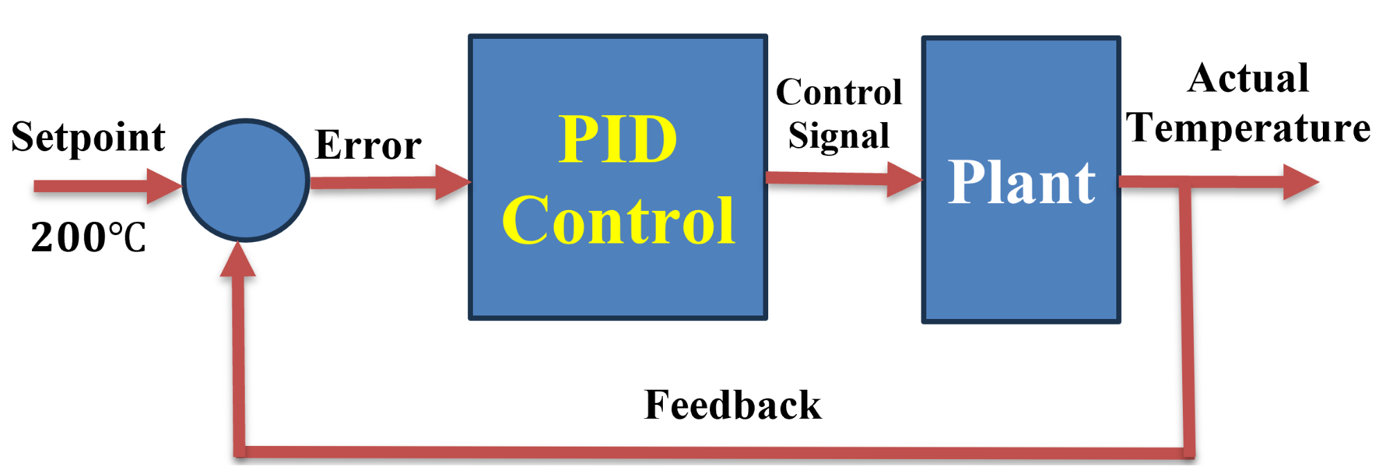 This section covers the experimental methods for creating two polymer-polymer composite specimens from recycled scrap tires. The function of PID temperature control is to adjust the actual temperature and maintain it at the set point for the desired temperature. PID temperature control is essential in thermal press machines for ensuring high performance and consistency in heat-driven processes. PID controllers maintain exact temperature setpoints (±5°C or better) [31][32], eliminating harmful fluctuations that could compromise material properties in recycled polymer composites, such as waste tires and HDPE. Figure 1 illustrates that the control signal generated by this type of controller is directly related to the error signal, which is the difference between the setpoint and the actual temperature. The related equations are presented as follows [33][34]. Where, is the proportional gain of the PID controller,