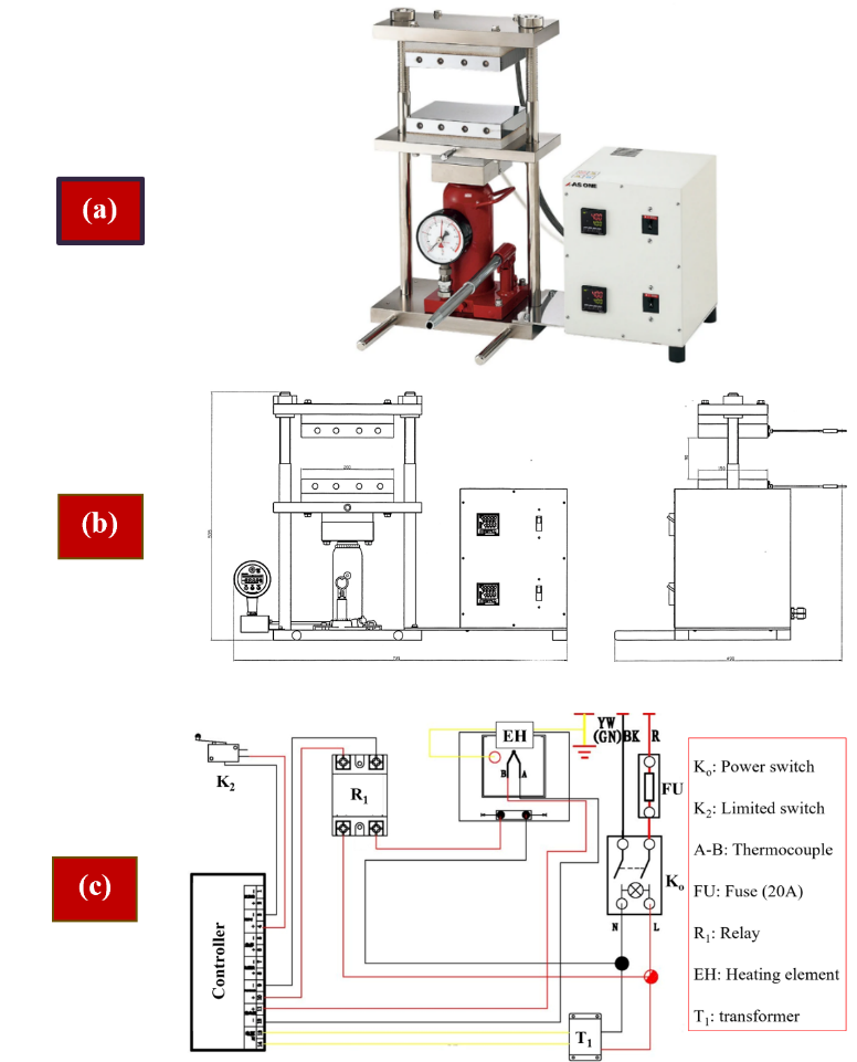 Figure 3. a) The press machine with the heating source, b) Schematic drawing of the press machine, and c) the electrical wire connections in the press machine