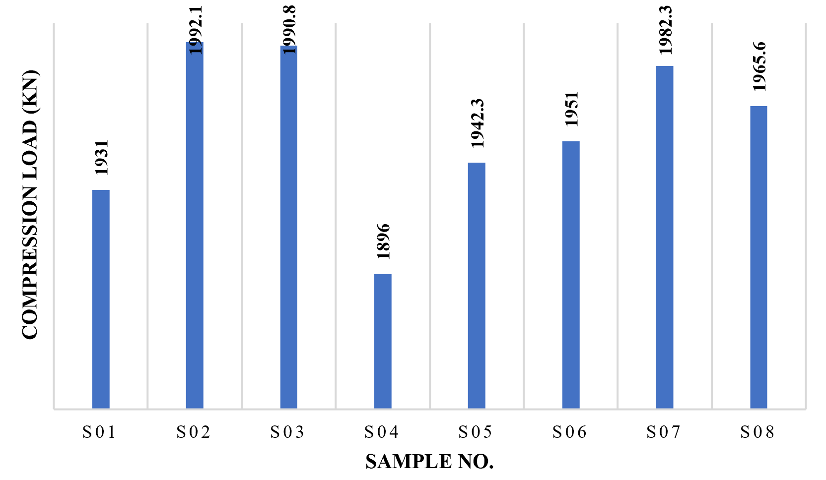 The compression tests revealed how effectively the material could absorb impacts, essential for marine fenders facing constant berthing loads. A compression testing machine (Digitec MATEST) was used to investigate the load capacity of the waste tire and polymer composite specimens. The test findings provided important information about the composites' compressive strength and potential use as marine fenders. Table 5 shows the compression load values for selected specimens from both groups. As indicated in Figure 6, the compression test results show several trends. The waste tire and RTV silicone composites deliver a generally more elevated compression load capability than the waste tire and HDPE composites, indicating that the waste tire and RTV silicone composite give better resistance to deformation. The compression load capacity increases by increasing waste tire content by up to 75% for the waste tire and RTV silicone composites. The current results provide the best balance between stiffness and compressive load resistance. Moreover, the waste tire and HDPE composite exhibit a more consistent trend, with the compression load capacity increasing slightly as waste tire content increases.