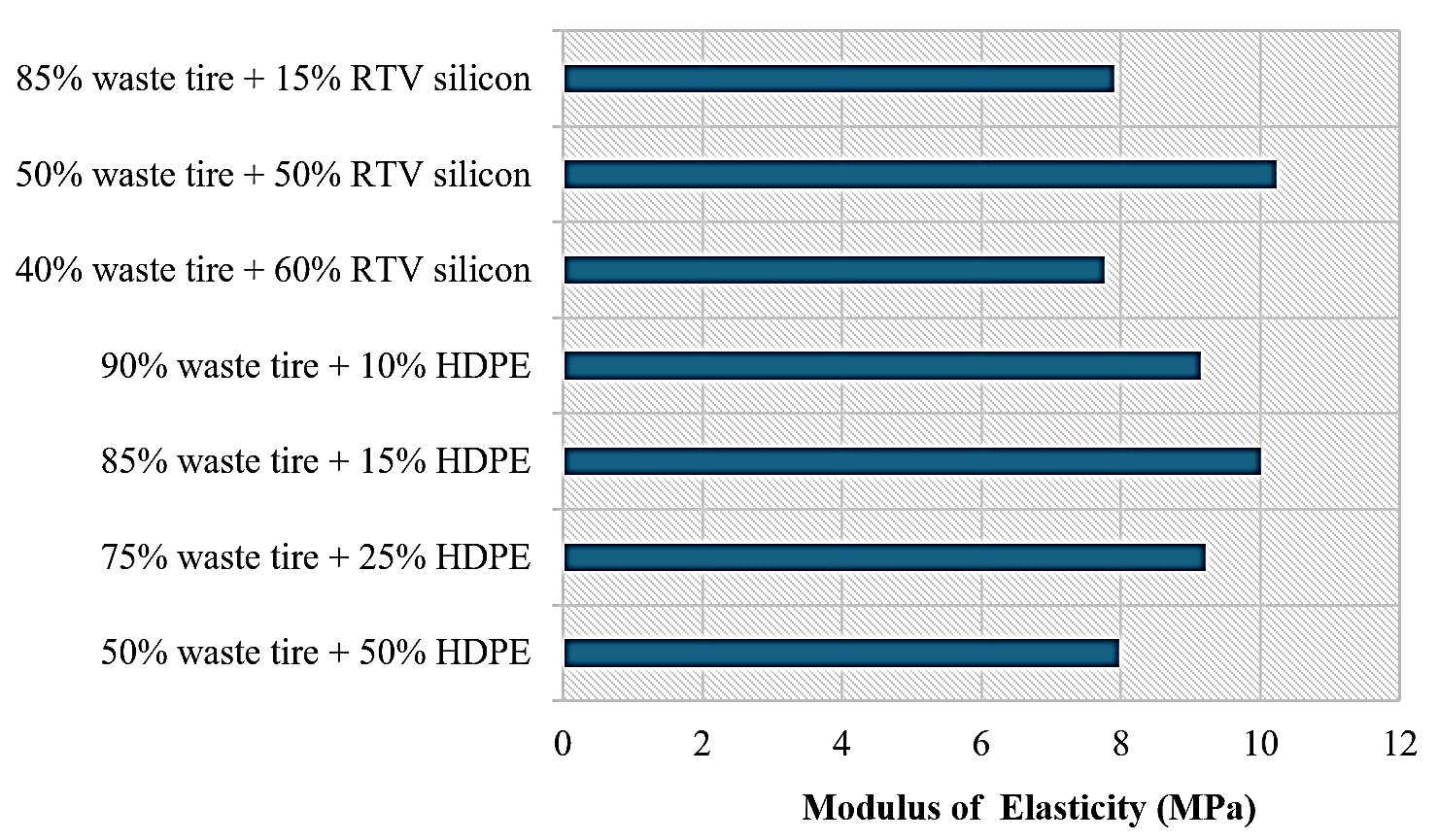 The modulus of elasticity (Young's modulus) is critical for the fenders because it influences their stiffness and effectively absorbs energy while minimizing the risk of permanent deformation or material failure. The modulus of elasticity (E) of the marine fender prototypes in this work is determined using an empirical equation based on Shore hardness (S) [42][43]. This method provides a practical approach when direct tensile testing is not feasible. The correlation relates Shore hardness to Young’s modulus through established equations, offering an approximate but useful measure of stiffness for comparative analysis. Using the above equation, Figure 8 shows the calculated modulus of elasticity for the different specimens. The findings show that the specimens with more waste tire content had an increased elastic modulus, which implies that a substantial portion of the composite material's rigidity is derived from the scrap tire component. Prototypes with higher waste tire content (e.g., 85% waste tire + 15% HDPE and 50% waste tire + 50% RTV silicon) may offer superior energy absorption and durability in marine fender applications compared to those with lower waste tire contents.