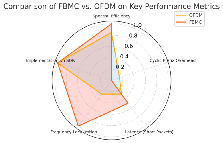 Finally, an illustration plot that compares the main performance indicators of FBMC and OFDM systems is shown in Figure 18. Due mainly to the use of well-localised prototype filters and the lack of a cyclic prefix, the plot demonstrates FBMC's superior performance in terms of frequency localisation and spectral efficiency. As can be seen, FBMC attains a higher normalised score in spectral efficiency because it completely removes the cyclic prefix, which causes a 10–20% overhead in traditional OFDM. On the other hand, OFDM exhibits reduced latency in short-packet transmissions, which may be useful in applications where delay requirements are strict. However, the latency difference disappears, and FBMC's performance benefits become more noticeable in high-bandwidth or continuous streaming scenarios. Additionally, the plot demonstrates both systems' compatibility with SDR platforms, including the USRP N210 utilized in this study. The comparative study backs up the case for FBMC adoption in flexible and cognitive radio systems of the future, especially in settings where coexistence in fragmented spectrum and spectral efficiency are crucial.