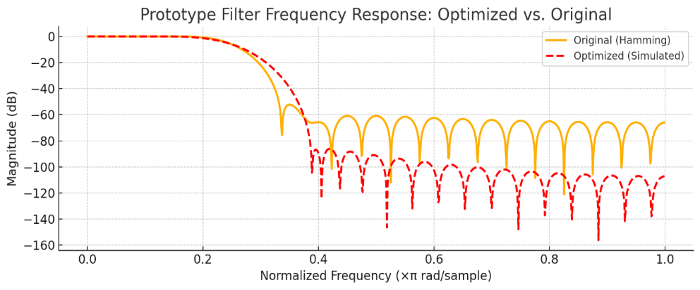 Although the implementation and functionality of an FBMC transmitter using a USRP platform are successfully demonstrated in this work, there is still a great deal of room for improvement through optimisation techniques. Future studies might examine how metaheuristic algorithms like Ant Colony Optimisation (ACO), Particle Swarm Optimisation (PSO), or Genetic Algorithms (GA) can be integrated to improve crucial system elements like filter design, subcarrier spacing, and power allocation. In multicarrier systems such as FBMC, where filter performance directly affects spectral efficiency, inter-symbol interference, and system robustness, these optimisation techniques are especially useful. For example, better sidelobe suppression and time-frequency localisation may result from optimised prototype filter coefficients, which would lower out-of-band emissions. Figure 19 illustrates the expected significance of this improvement, showing that the frequency response of an optimised filter will have lower sidelobe levels and a noticeably sharper roll-off than the un-optimised design. This is a prime example of how algorithm-driven design can result in noticeable enhancements to spectral containment and signal quality. Furthermore, based on real-time channel feedback, adaptive resource allocation strategies driven by optimisation algorithms could dynamically modify transmit power and modulation schemes. These improvements would make the transmitter more robust and effective in a range of network scenarios. In addition to improving system performance, integrating these clever, algorithmic solutions would match FBMC architectures to the requirements of reconfigurable, cognitive, and next-generation radio systems.