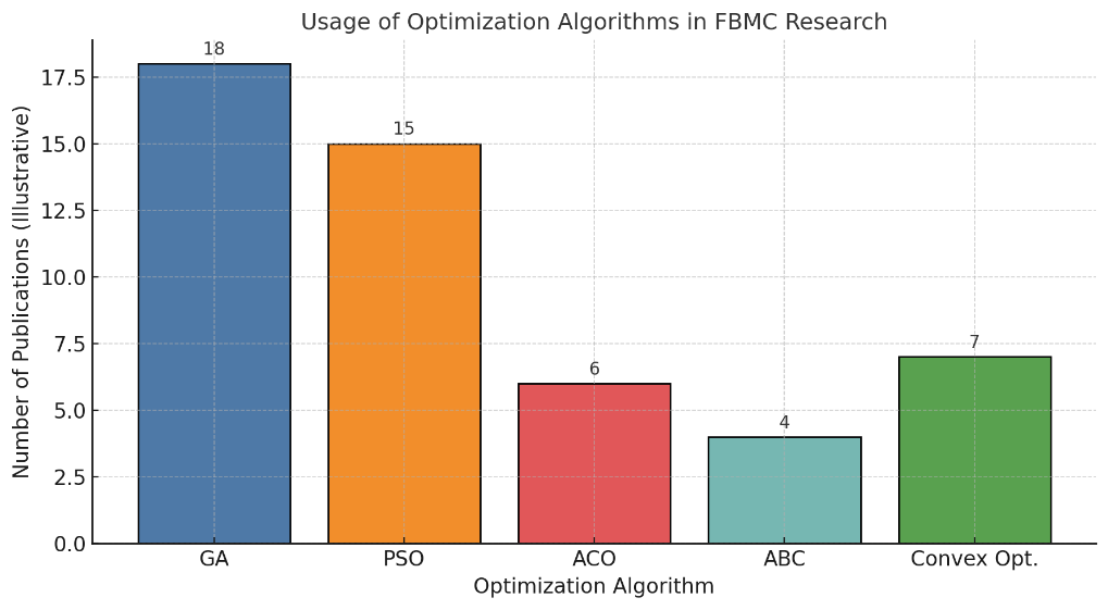 A comparative review of optimisation techniques used for FBMC systems in recent scholarly works is shown in Figure 20. The two most commonly used methods among these are PSO and GA. Their efficiency in tasks like filter bank design and Peak-to-Average Power Ratio (PAPR) reduction is what has led to their widespread adoption [50]. Furthermore, convex optimisation methods have demonstrated promise in producing mathematically rigorous and constraint-aware filter designs, especially those based on Quadratically Constrained Quadratic Programming (QCQP). Overall, by showcasing both well-established and cutting-edge optimisation techniques, this illustration supports the rationale for the suggested future research direction. In order to improve the performance and adaptability of the FBMC system, it also highlights the potential for more research, specifically in the application, comparative analysis, and hybridisation of these algorithms [50]-[52].