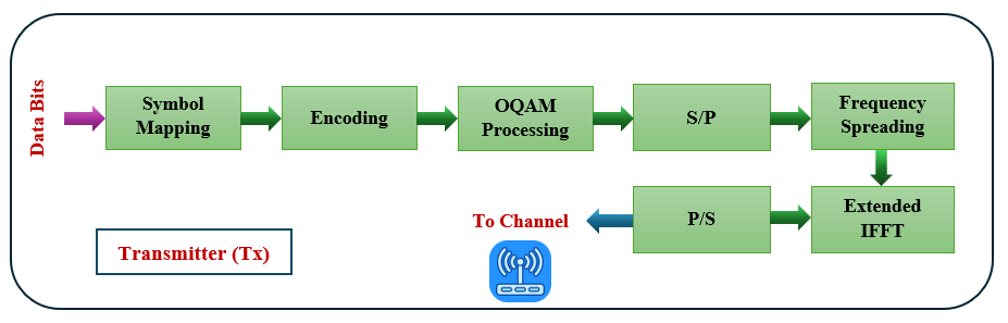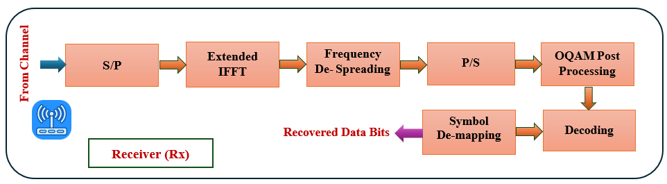 The general block diagram of the FBMC communication system, which encompasses the transmitter and receiver processes, is shown in Figure 2. The data bits are first converted into symbols at the transmitter side using an appropriate modulation scheme, like QAM, as shown in Figure 2(a). To guarantee error correction during transmission, these symbols are subsequently encoded. To get ready for multi-carrier transmission, the encoded symbols go through QAM processing [38]-[41]. To enable effective transmission across several carriers, the symbols are then changed from serial to parallel format (S/P). Frequency spreading is then used to increase the signal's resilience to interference by dispersing it over a larger frequency range. The signal is then converted into the time domain for transmission using the Extended Inverse Fast Fourier Transform (IFFT). The received signal is first converted from parallel to serial form (S/P) on the receiver side, as illustrated in Figure 2(b). Frequency de-spreading is used to undo the initial spreading process after the Extended IFFT is used once more to move the signal into the frequency domain. The modulated symbols are then extracted from the data using OQAM post-processing. The original data bits are recovered by de-mapping these symbols, and the transmitted data is then recovered by decoding them. Reliable data transmission and recovery over the communication channel are efficiently ensured by this system [42].