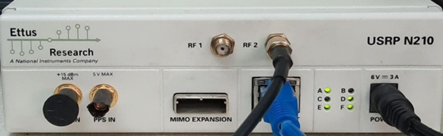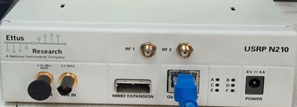 On two antennas, the USRP can receive and broadcast data in real-time. Because all sampling clocks and local oscillators are entirely coherent, Multiple Inputs-Multiple Outputs (MIMO) systems can be built. High-rate processing takes performed in the FPGA of the USRP, while lower-rate processing takes place on the host computer. In the FPGA, the two onboard Digital Downconverters (DDCs) combine, filter, and decimate incoming signals (from 64 MS/s). Before translating baseband signals to the desired output frequency, two digital upconverters (DUCs) interpolate them to 128 MS/s. The DDCs and DUCs, together with the large sample rates, make analog filtering a lot easier. Flexible, fully integrated RF front-ends are provided by daughterboards installed on the USRP. Different frequencies can be employed for a wide range of applications thanks to the huge variety of daughterboards available. For RF I/O, the USRP can support up to two RF transceiver daughterboards (or two transmit and two receive) [49]. The USRP N210 was used to create the FBMC signal experimentally, as shown in Figure 4. This high-performance platform is well-suited for real-time signal processing in SDR applications. Table 2 provides important information about the USRP N210's operational statuses during the experiment and also provides a detailed description of the LED indicators' functions. These LEDs serve as diagnostic tools that enable users to monitor performance and identify potential issues during signal processing.