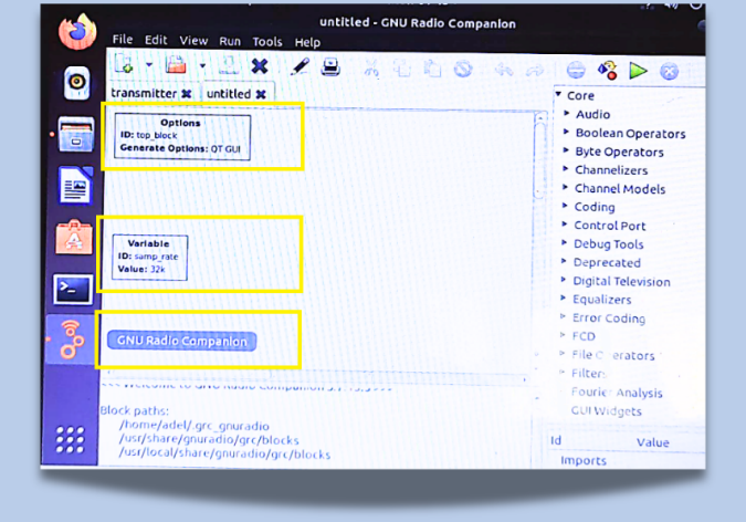 GNU Radio's ability to process signals in real-time and manage high-speed data streams with minimal latency is one of its primary features. Applications that need prompt responses, like scientific data collection and communication systems, depend on this. Additional versatility for both practical deployments and experimental setups is provided by the toolkit's modularity, which also makes it simple to integrate with different hardware devices. Eventually, it is perfect for creating communication systems across various standards and bands because of its reconfigurability and support for multimode operations. Additionally, it makes it possible to create unique signal processing blocks in Python or C++. It can serve as a monitoring platform for equipment such as data acquisition systems (DAQ) with the right control blocks, displaying gathered data using sink blocks to create time-domain or frequency-domain plots. The main screen of the GNU Radio 3.7 application is shown in Figure 3, demonstrating its user-friendly graphical interface for SDR system design and testing [47][48].