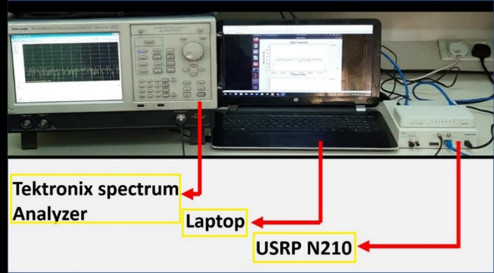 The central control and processing unit is a laptop running GNU Radio software, which is used to generate the FBMC-modulated signal. To enable the digitally modulated signal to be transmitted, a network hub connects the laptop to the USRP N210 software-defined radio. With this setup, the transmitted signal can be seen and tracked in real time on the laptop screen. Concurrently, a Tektronix spectrum analyser is directly connected to the USRP's RF output, allowing for accurate frequency-domain observation of the FBMC signal. Figure 6 shows the full experimental setup, showing how the laptop, USRP N210, and spectrum analyser interact.