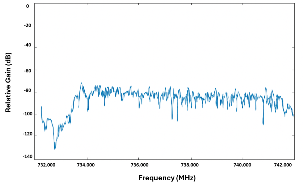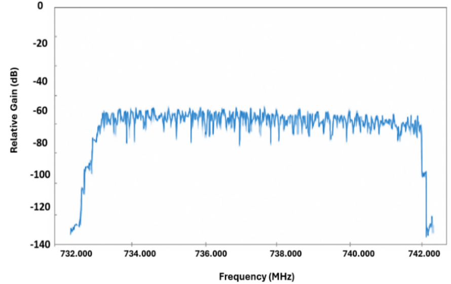 Experimental testing was carried out in the Ministry of Science and Technology's Laboratory of Space and Communication Research in Baghdad following system configuration and the successful loading of the FBMC design onto the USRP N210. The USRP N210's operational state as a transmitter is shown in Figure 8. The GNU Radio flow graph's successful execution and transmission are confirmed by the LED indicator "A" turning on. The transmitted FBMC signal using 32 subcarriers is shown in Figure 9. The frequency band that is occupied ranges from 733 MHz to 744 MHz, for a total bandwidth of 11 MHz. The observed fluctuations range from -100 dB to -60 dB, indicating a fluctuation margin of 40 dB, while the signal amplitude stays constant at -60 dB. The 64-subcarrier FBMC signal transmission is shown in Figure 10. In this instance, the signal keeps the same 11 MHz bandwidth while spanning a frequency range of 732 MHz to 743 MHz. With fluctuations between -90 dB and -60 dB, the amplitude stays constant at -60 dB, resulting in a decreased fluctuation margin of 30 dB.