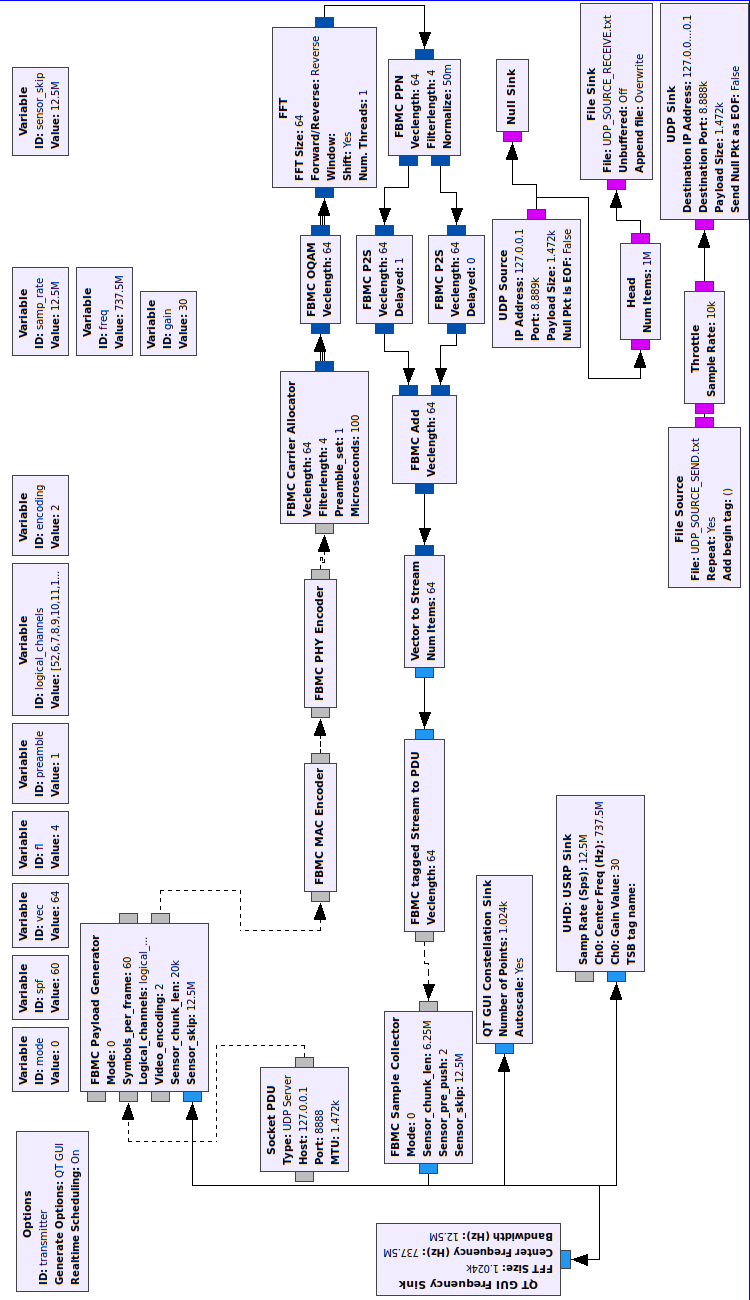 Finally, the UHD USRP sink block is crucial to sending the processed signal through hardware after the design flow graph. The samples can be transmitted to the physical medium thanks to this block, which receives the flow graph's final output and interfaces with the USRP device. An essential part of the entire FBMC transmission process, the UHD USRP sink guarantees smooth hardware platform integration, enabling the conversion of software-defined signal processing into a transmitted signal in the real world. It should be noted that a USRP N210 device was used for the testing and validation of the FBMC transmitter in an indoor laboratory setting. The transmission occurred over short-range line-of-sight (LOS) links, with the transmitter and receiver typically separated by 3 to 5 meters. The environment had moderate frequency selectivity, little delay spread, and mild multipath fading because of the controlled indoor environment. Due to the experiments' relatively shielded location, which reduced cross-channel interference from other wireless systems, external radio frequency interference was minimal. Although it was possible, the FBMC signal's integrity was not significantly impacted by the slight background interference from Wi-Fi and Bluetooth devices using nearby ISM bands. In addition to serving as a useful guide for upcoming hardware-based experiments aiming for reproducibility, these conditions offer a reasonably clean baseline for confirming waveform generation and spectral characteristics.