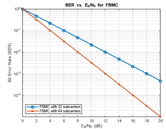 Figure 11. BER performance of FBMC systems with 32 and 64 subcarriers