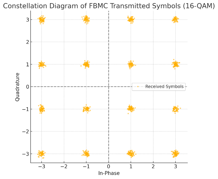 dB. The increased number of subcarriers makes the signal more resilient to channel impairments, resulting in finer frequency resolution and reduced inter-symbol interference (ISI), which contributes to this performance gain. The 64-subcarrier curve's steeper slope indicates better resilience to fading and noise, which makes it a better option for high-throughput or error-sensitive communication situations. These results support the scalability of FBMC for next-generation wireless standards and validate the crucial role that subcarrier count plays in determining the error performance of FBMC systems. In order to simulate and visualise BER performance trends, MATLAB was used to create the previous plot. The constellation diagram of FBMC-transmitted symbols with 16-QAM modulation at a 20 dB SNR is shown in Figure 12. The received symbols are plotted in the In-Phase (I) and Quadrature (Q) components of the diagram. Accurate symbol detection and little channel distortion are indicated by the closely clustered points surrounding optimal constellation locations. This illustration confirms that baseband processing and channel equalisation were successfully implemented by showing the modulation fidelity of the FBMC system in noisy environments. Additionally, it offers visual proof of the system's resistance to AWGN, confirming the theoretical predictions of FBMC's superior resilience and spectral shaping. The MATLAB-generated plot validates the experimental results and boosts trust in the system's functionality.