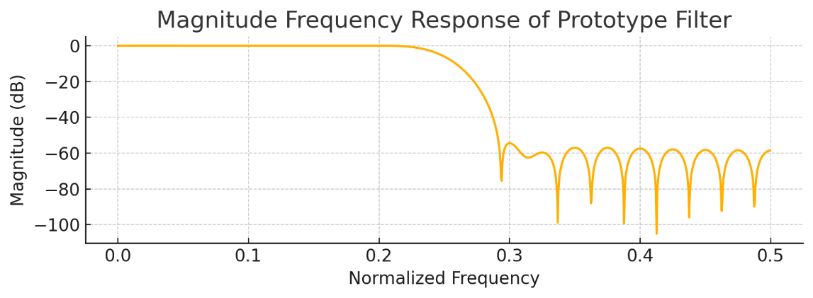 Figure 14. Frequency response of the prototype filter showing sharp attenuation and sidelobe suppression