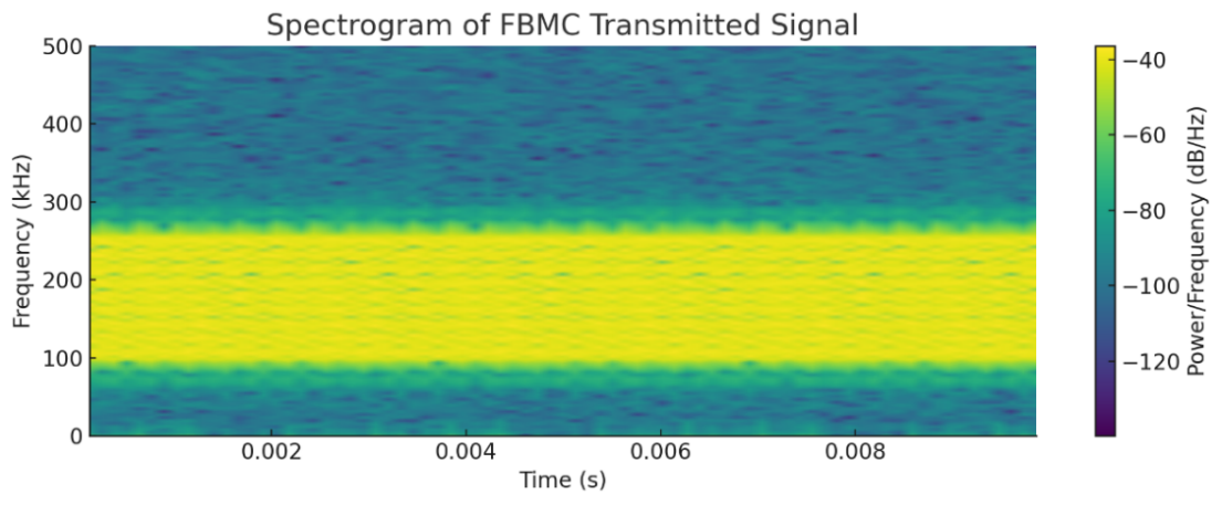 The impulse response of the low-pass filter prototype used in the FBMC transmitter is shown in Figure 13. The response exhibits the traits of a superior finite impulse response (FIR) filter created with a Hamming window: it is symmetric, well-localised in time, and decays smoothly. This Figure 13 highlights the filter's time-domain localisation, which is crucial for reducing ISI, a major problem in multicarrier systems. Theoretically, FBMC has the advantage of not requiring a cyclic prefix, which improves spectral efficiency. This is supported by the filter's ability to effectively confine energy within a limited number of taps. The magnitude frequency response of the same prototype filter is shown in Figure 14. Strong frequency selectivity and less spectral leakage are indicated by the plot's flat passband, sharp transition, and noticeably attenuated sidelobes. This Figure 14 is crucial for verifying the filter bank design's spectral containment capabilities in FBMC systems. FBMC uses carefully thought-out filters to reduce adjacent channel interference, in contrast to OFDM, which has high out-of-band emissions because of rectangular pulse shaping. This frequency-domain analysis provides visual evidence that the filter satisfies the spectral shaping objectives necessary for 5G and cognitive radio applications. The FBMC-transmitted signal's spectrogram, which shows the power distribution over time and frequency, as shown in Figure 15. The Figure 15 makes it evident that the subcarriers are uniformly spaced and have a narrow bandwidth in both domains. The purpose of this Figure 15 is to demonstrate the time-frequency localisation capability of FBMC, which is a significant benefit over traditional OFDM. The prototype filter successfully confines the signal in time and frequency, as evidenced by the lack of spectral smearing or overlap. This outcome demonstrates that FBMC is appropriate for dynamic spectrum settings where accuracy and minimal interference are crucial.